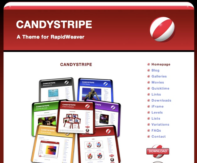 There are galleries, movies, downloads, links and a dummy contact form. The blog will be updated from time to time with news of further developments in the theme. If you find any bugs or can think of something you’d like to see in Candystripe, the Contact link in the footer is active