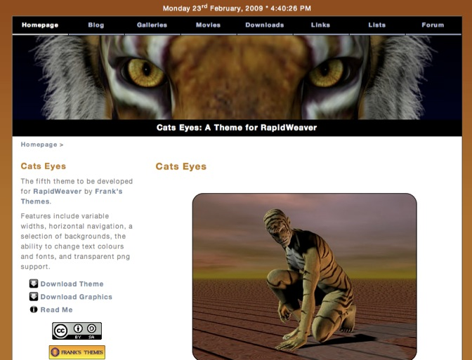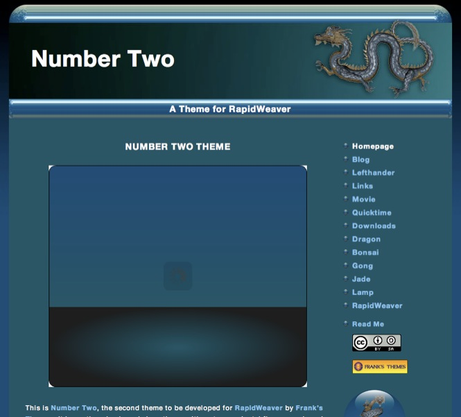 The fifth theme to be developed for RapidWeaver by Frank’s Themes. Features include variable widths, horizontal navigation, a selection of backgrounds, the ability to change text colours and fonts, and transparent png support.