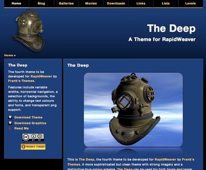 This is The Deep, the fourth theme to be developed for RapidWeaver by Frank’s Themes. A more sophisticated but clean theme with strong imagery and a distinctive blue colour scheme, The Deep can be used for both blogs and larger projects. The Deep comes with a selection of headers and backgrounds, the ability to move or hide the sidebar, and is the first of Frank’s Themes to feature a choice of widths. Other features include options for changing text colours and fonts, horizontal navigation, and transparent png support.
