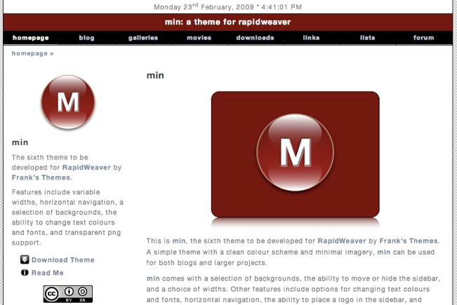 This is min, the sixth theme to be developed for RapidWeaver by Frank’s Themes. A simple theme with a clean colour scheme and minimal imagery, min can be used for both blogs and larger projects. min comes with a selection of backgrounds, the ability to move or hide the sidebar, and a choice of widths. Other features include options for changing text colours and fonts, horizontal navigation, the ability to place a logo in the sidebar, and transparent png support.