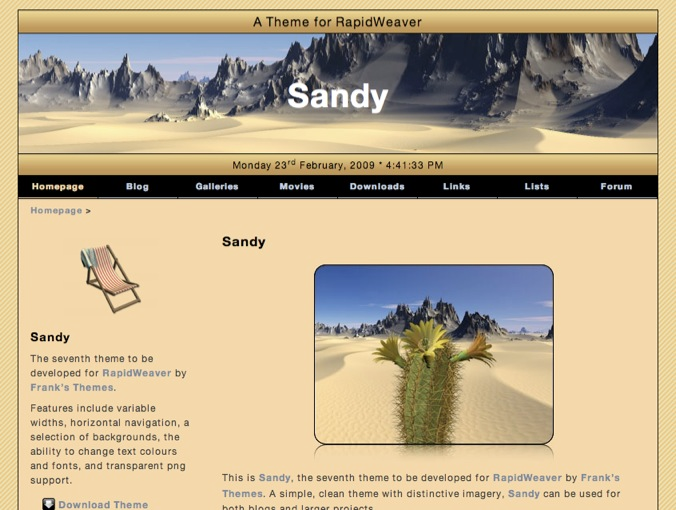 This is Sandy, the seventh theme to be developed for RapidWeaver by Frank’s Themes. A simple, clean theme with distinctive imagery, Sandy can be used for both blogs and larger projects. Sandy comes with a selection of backgrounds and headers, the ability to move or hide the sidebar, and a choice of widths. Other features include options for changing text colours and fonts, horizontal navigation, the ability to place a logo in the sidebar, and transparent png support. Visit the Lists pages to see some of the variations possible with the theme.