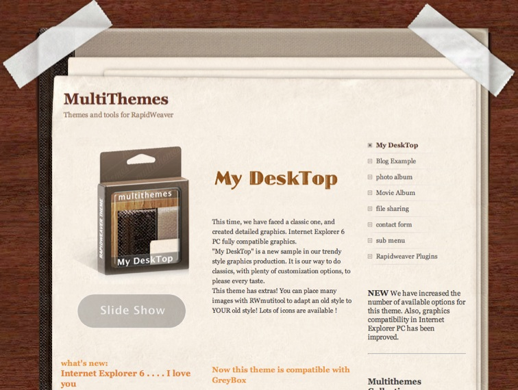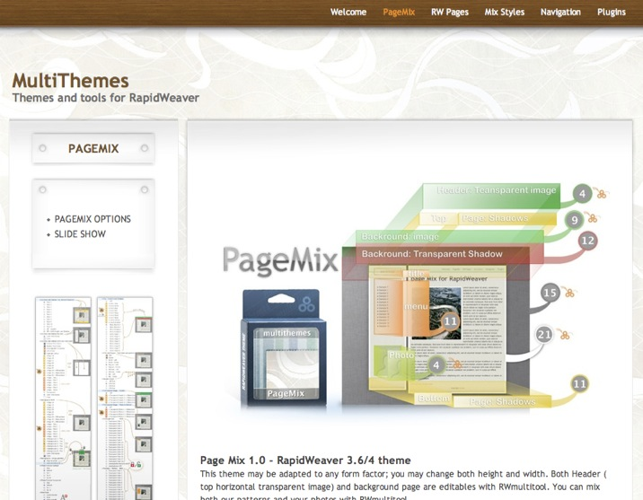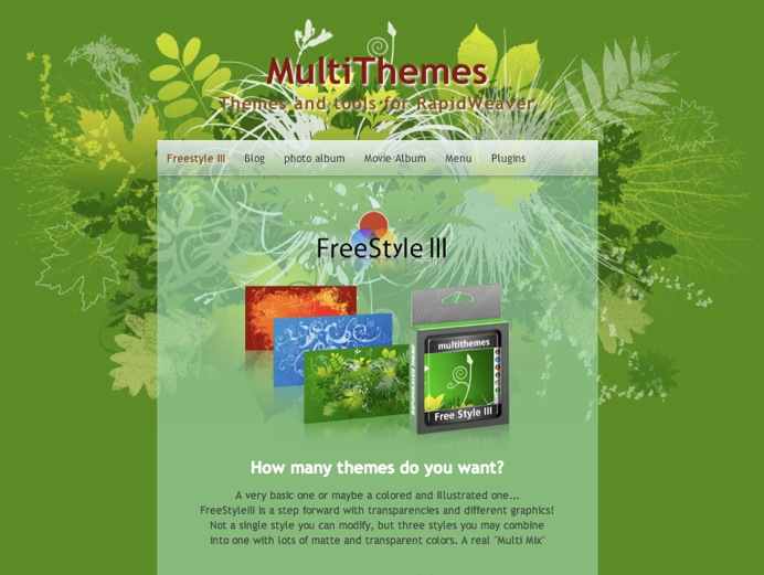 http://www.multithemes.com/Multithemes makes professional Themes for RapidWeaver. Graphics and structure of our themes are carefully crafted. You can expect them to work flawlessly in the most common browsers for Mac and PC. Our themes are optimized for Safari and Firefox (Mac), Internet Explorer and FIrefox (PC).