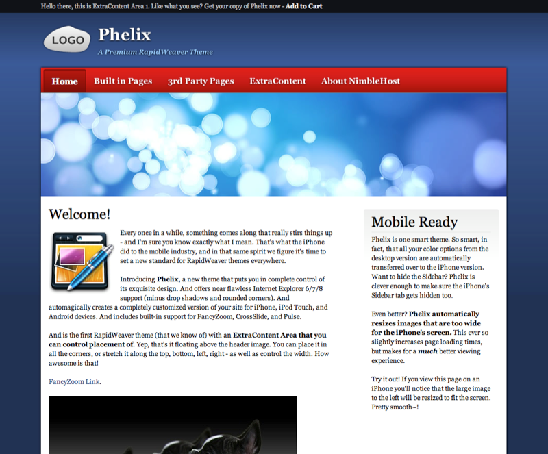 Phelix, puts you in complete control of its exquisite design. And offers near flawless Internet Explorer 6/7/8 support (minus drop shadows and rounded corners). And automagically creates a completely customized version of your site for iPad, iPhone, iPod Touch, and Android devices. And includes built-in support for FancyZoom, CrossSlide, and Pulse. And is the first RapidWeaver theme (that we know of) with an ExtraContent Area that you can control placement of. Yep, Phelix is one smart theme. So smart, in fact, that all your color options from the desktop version are automatically transferred over to the iPhone version. Want to hide the Sidebar? Phelix is clever enough to make sure the iPhone's Sidebar tab gets hidden too.