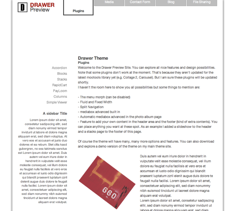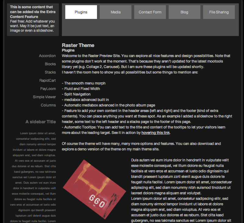 - Feature to add your own content in the header areas (left and right) and the footer (kind of extra contents). You can place anything you want at these spot. As an example I added a slideshow to the right header, some text to the left header and a stacks page to the footer of this page.