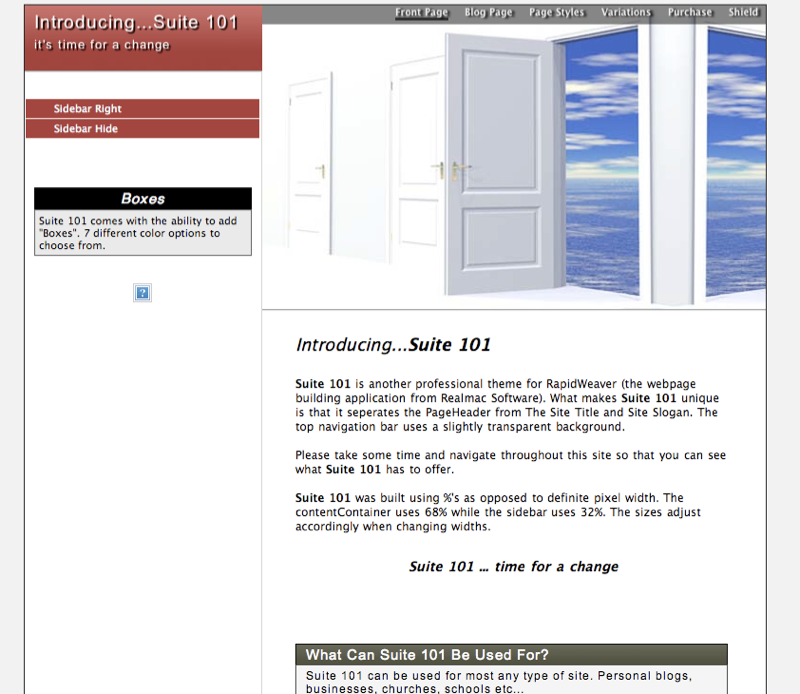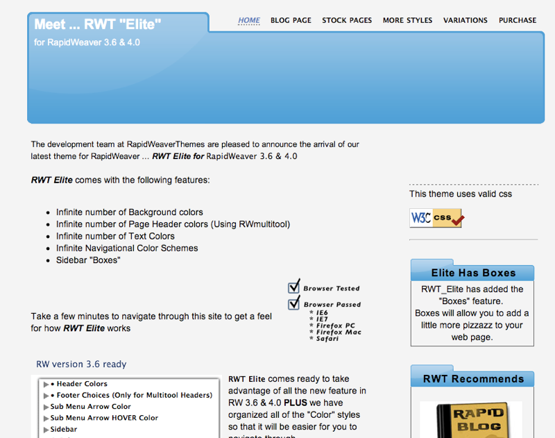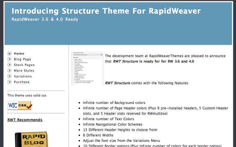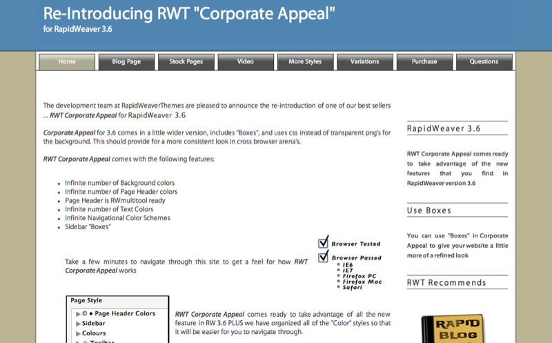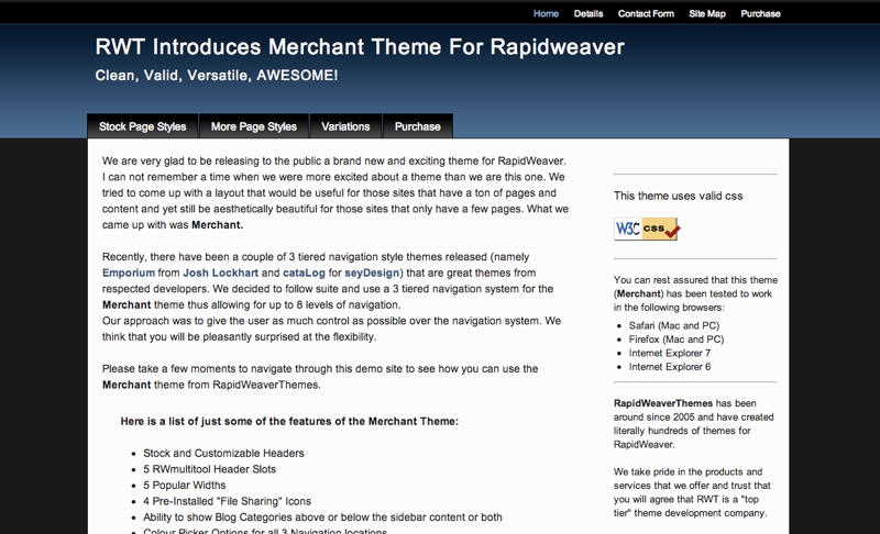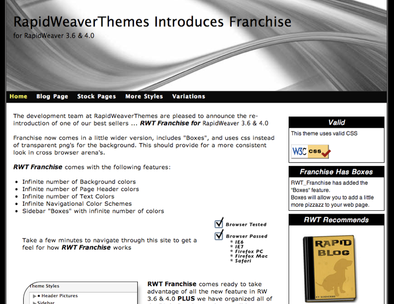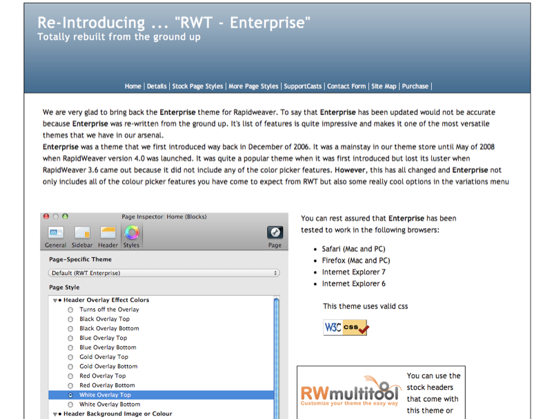 Enterprise was a theme that we first introduced way back in December of 2006. It was a mainstay in our theme store until May of 2008 when RapidWeaver version 4.0 was launched. It was quite a popular theme when it was first introduced but lost its luster when RapidWeaver 3.6 came out because it did not include any of the color picker features. However, this has all changed and Enterprise not only includes all of the colour picker features you have come to expect from RWT but also some really cool options in the variations menu.