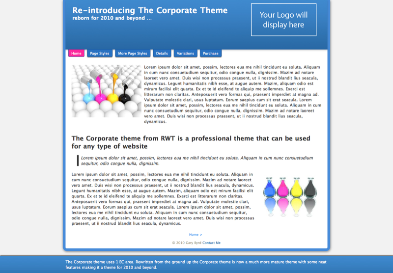 The Corporate theme now includes an EC area located in a fixed position at the bottom of the screen that can be turned on or off on a per page basis. I have also added some really nice CSS3 features to give the theme a little extra eye candy. The Corporate theme includes the following: