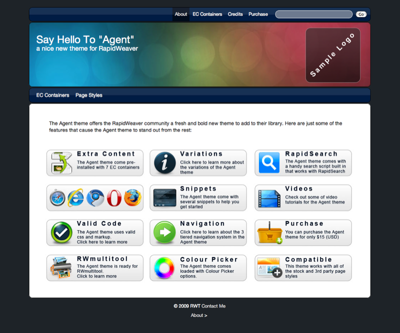 The Agent theme is a beautifully designed theme that uses a 3 tiered navigations system allowing you to organize your site the way that you want. Agent also comes with a RapidSearch search box pre-installed that can be turned on or off on a page by page basis. Other Features Include: