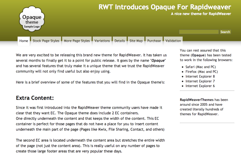 The Opaque theme offers a number of features ... some that unique and have never been done before in a RW theme. The Opaque theme comes pre-installed with a RapidSearch search box that will let you add a search box to your theme like all the cool sites are doing these days.