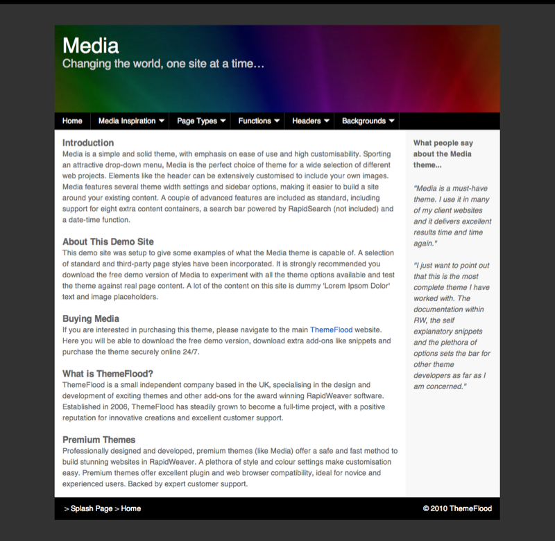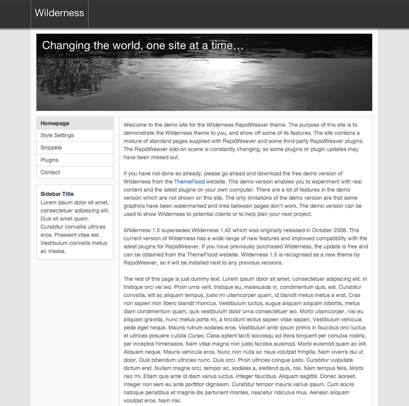 A perfect RapidWeaver theme for creating professional websites. Wilderness gives you numerous customisable options and boasts excellent compatibility with a wide range of web browsers and third-party RapidWeaver plugins. This theme was originally introduced in October 2008, based along a similar colour scheme to the Sharp theme supplied with RapidWeaver. It has since grown into a popular third-party theme and a recent update sees many high-end features added. A wide range of both text and colour settings are included with the theme. Heavier modifications can be made including sidebar width and position, theme width and header container height. The header container itself has support for 40 custom images, on top of several example images supplied. 14 Extra Content containers are built in, alongside 7 logo image placement options.