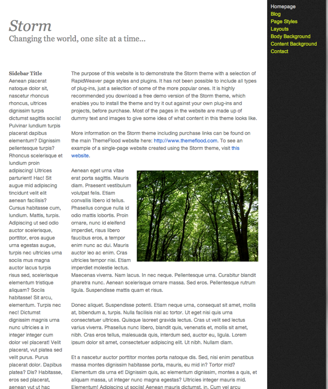 Storm is a brand new premium theme for RapidWeaver. The basic concept was to develop a theme with a vertical columned appearance. The actual content, sidebar and navigation columns all have equal heights and the theme is left aligned. Storm offers a theme which is both minimalist and contemporary in style, making it an ideal choice for a range of different projects. It puts a slightly different slant on theme design. A good range of powerful theme settings are built in, enabling easy theme customisation. Alongside options for a static background, Storm incorporates an optional sliding animated background using jQuery javascript. The theme also builds in support for smooth-scrolling anchor links, making this a perfect theme for creating single-page websites.