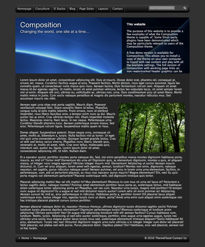 This theme started out life as a humble free theme called Aperture, originally developed by Dary Barclay. Increased demand for more features and better compatibility saw a new 'pro' version released in 2008. Composition has continued to grow in popularity, thanks to its distinct 'light on dark' colour scheme, vivid header container and complete range of theme settings. Ideal for marketing, portfolio and photojournalism websites.