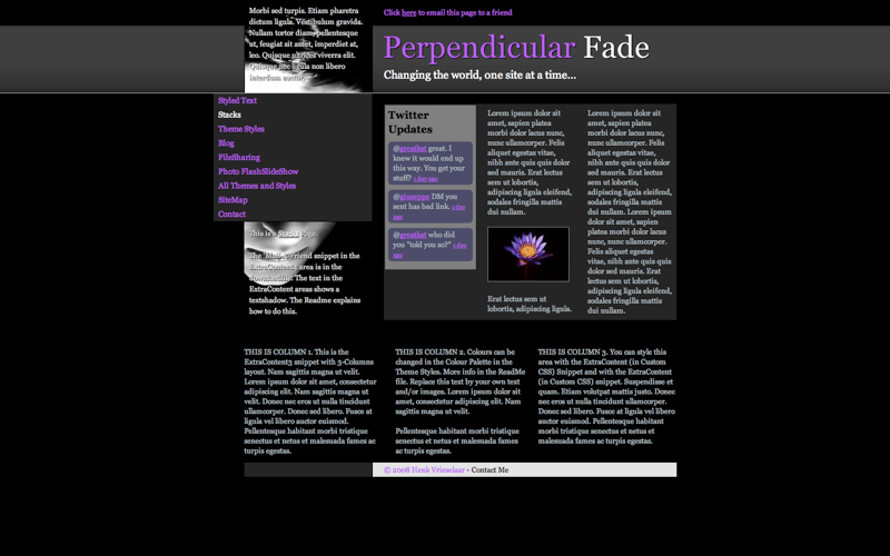 This is a RapidWeaver theme with many colour styles, effects on the header image, and the sidebar. Well, what should I say more.... just have a look at the theme and its variations.