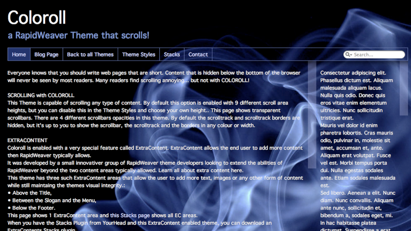 INTERIOR By default without scrollbars, although you can enable a scrollbar in the Theme Styles (the same scrollbar as in your browser) when there is more content than the height of your content container. This theme works with all RapidWeaver plugins and stacks. -