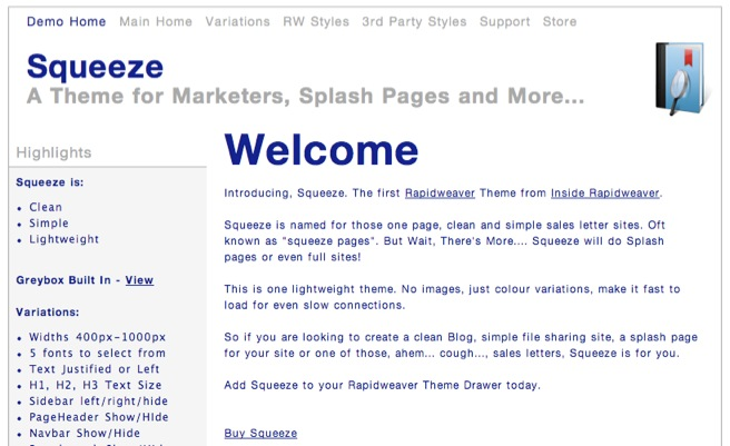 Squeeze is named for those one page, clean and simple sales letter sites. Oft known as "squeeze pages". But Wait, There's More.... Squeeze will do Splash pages or even full sites! This is one lightweight theme. No images, just colour variations, make it fast to load for even slow connections. So if you are looking to create a clean Blog, simple file sharing site, a splash page for your site or one of those, ahem... cough..., sales letters, Squeeze is for you