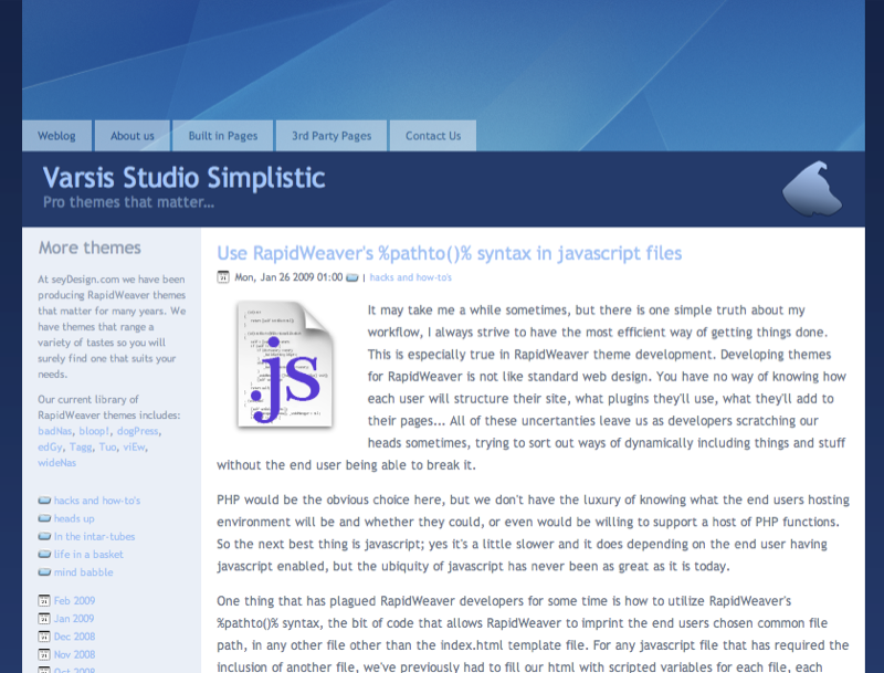 badNas, a Pro offering from the combined efforts of seyDoggy and Varsis Studios, offers both attractive tabbed top navigation coupled with the functional sidebar sub-navigation. The first in it's class to offer full IE6 png transparency support, badNas was, and continues to be a revolutionary RapidWeaver theme. The badNas pro features include; full color options, split navigation, header selection, RWmultitool Lite ready and more.
