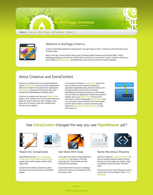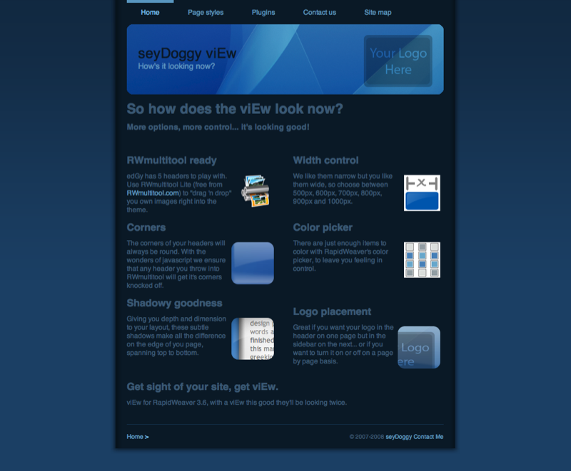 From it's humble beginnings as a one time narrow, fixed width theme, edGy quickly became a hot item when variable widths were added to this theme in it's RapidWeaver 3.6 upgrade. edGy is now one of or most versatile themes. edGy has a complete Pro feature set; full color options, width options, split navigation, header selection, RWmultitool Lite ready and more.